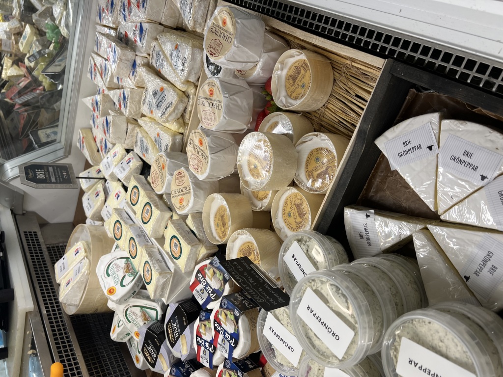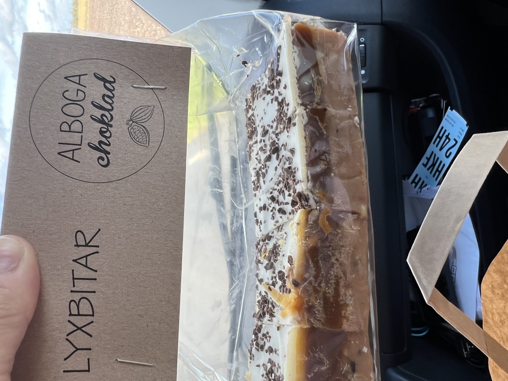 vad skulle vi hitta på, Clas hittade att det låg en chokladbutik i närheten och Emelie ville åka till Falköping för att gå på ostbiff. Så vi satte först av mot chokladbutiken, där hade de även trädgårds och hus pynt, samt en blomsterhandel. Strosade runt lite där sen köpte vi choklad förstås. Sedan var det av mot falköping det var en massa grusväg. När vi väl kom fram till falbyggdens osteria så gick vi in och mötttes av en helt sjukt massa ostar. Smakade det som gick o smaka, för att sen gå på buffé men där var det så mycket folk och man hade redan ätit så mycket ost så det räckte med en god fralla. Sedan blev det inköp av både ostar och chark som vi skulle ha till kvällen. Ut till husbilen igen och satte kursen tillbaks till vår emerit plats. Här startade vi upp en liten eld, och bara satt o njöt av den en stund, sedan blev det ost o chark middag. Lite senare blev det även bad i sjön…
